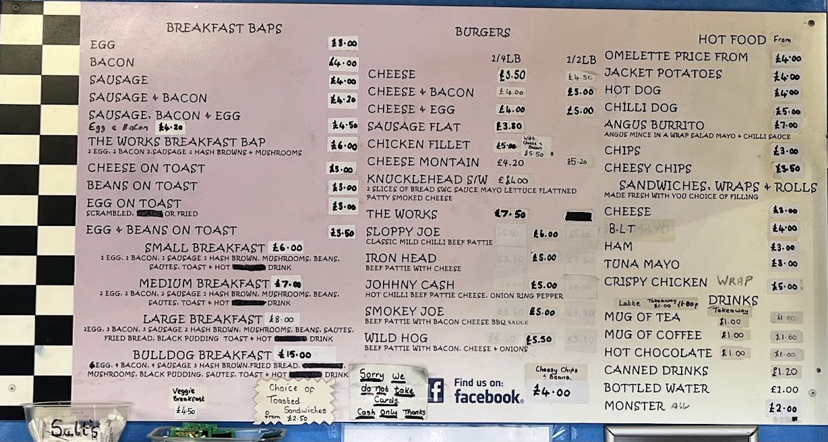 Popular dishes include their generously portioned breakfasts that feature an enticing array of classic ingredients: sizzling sausages, crispy bacon, perfectly cooked eggs, and golden fried bread, all beautifully accompanied by tomatoes, mushrooms, baked beans, and buttery sautéed potatoes, making their medium breakfast a fan favorite for just £7. If you have a craving for something different, their burgers like the Smokey Joe or the Cheese & Bacon burger, priced around £4.20, are just as enticing, delivering satisfying flavors that keep the taste buds dancing. And for those looking for a quick bite, you can't go wrong with their selection of hot dogs or wraps, sure to please anyone's palate.